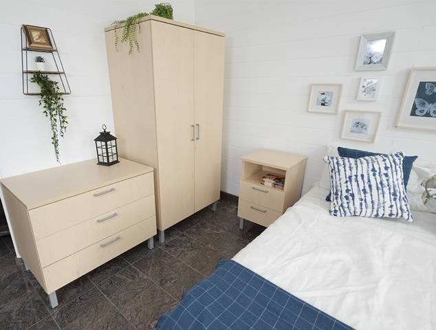 Notre collection Saguenay se distingue par un style simple et épuré, elle est facile d'entretien et disponible en 4 couleurs. Le fini en mélamine va jusqu'au sol pour limiter les chutes.