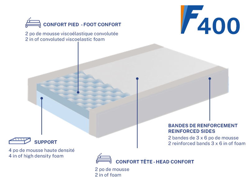 Les mousses utilisées dans la fabrication de nos matelas répondent aux standards établis pour le test Cal. tech. # 117 -2013. Un tricot de coton Modacrylique Nomex Ignifuge recouvre toutes nos mousses. Il répond aux normes CAN/ULC S-137 et 16 CFR Part 1633 (US).