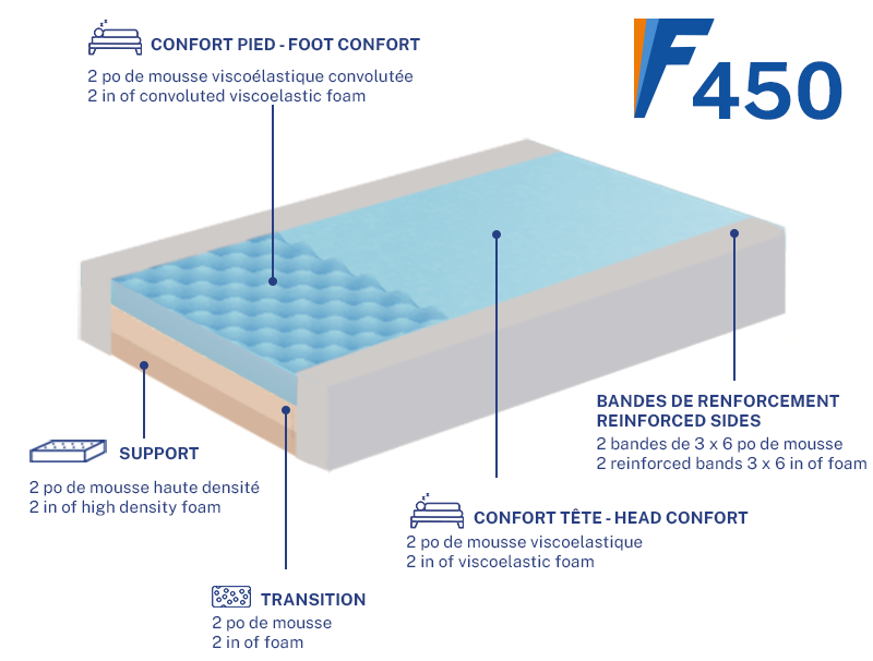 Les mousses utilisées dans la fabrication de nos matelas répondent aux standards établis pour le test Cal. tech. # 117 -2013. Un tricot de coton Modacrylique Nomex Ignifuge recouvre toutes nos mousses. Il répond aux normes CAN/ULC S-137 et 16 CFR Part 1633 (US).