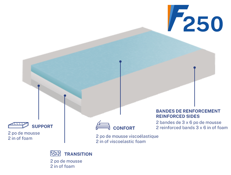 Les mousses utilisées dans la fabrication de nos matelas répondent aux standards établis pou le test Cal. tech. # 117 -2013. Un tricot de coton Modacrylique Nomex Ignifuge recouvre toutes nos mousses. Il répond aux normes CAN/ULC S-137 et 16 CFR Part 1633 (US).